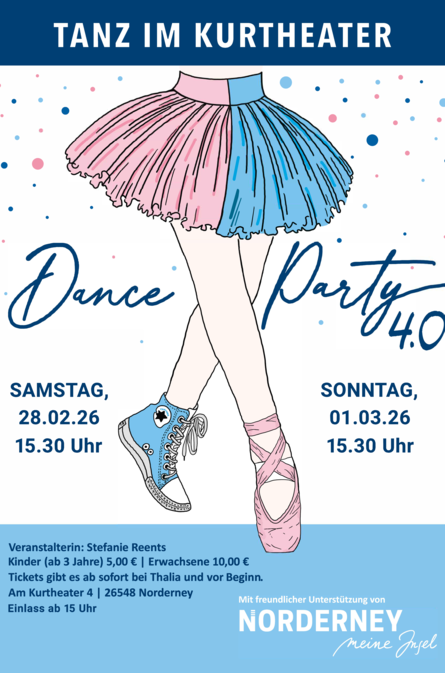 Die Dance Party 4.0 nimmt euch mit auf eine zweistündige Tanzreise bestehend aus Ballett, Jazz, Contemporary, Musical und Street Dance. Unter der Leitung von Stefanie Reents und Sina Stoppe haben über 40 Norderneyer Kinder und Jugendliche zwischen 7 und 20 Jahren die verschiedensten Choreografien erarbeitet und freuen sich, ihre Ergebnisse zum bereits vierten Mal im Kurtheater präsentieren zu können.