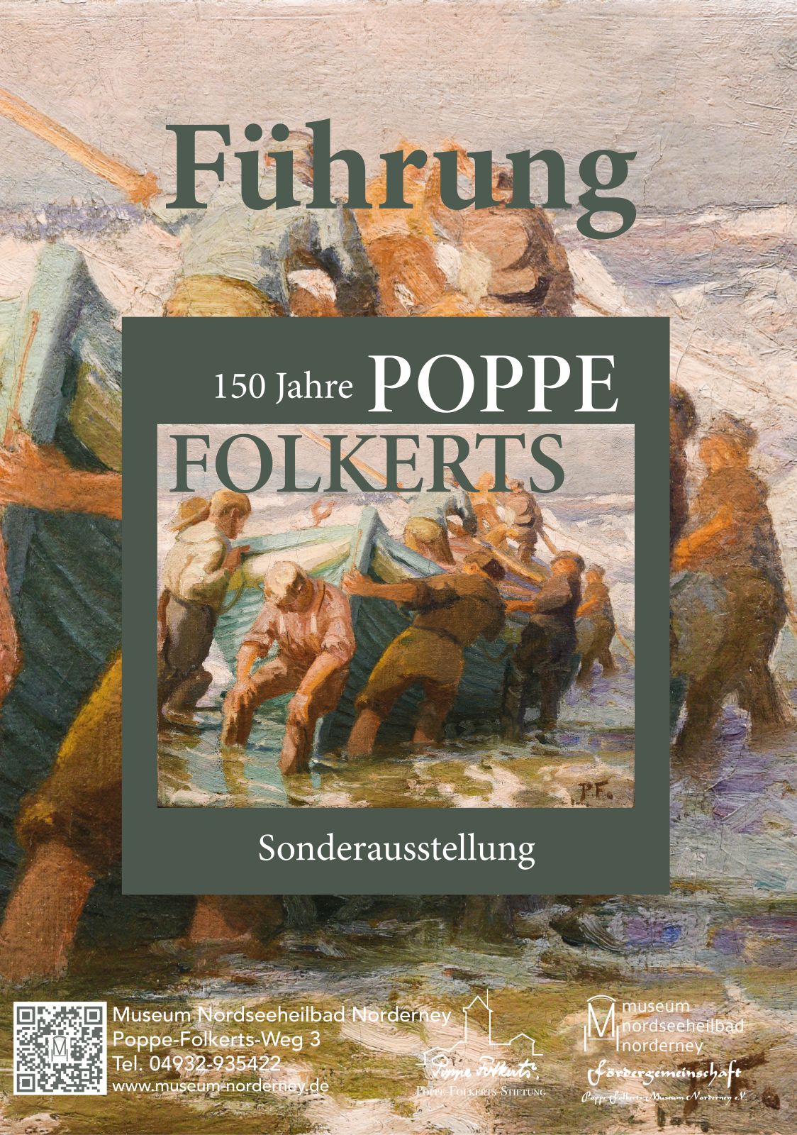 Anlässlich des 150. Geburtstags von Poppe Folkerts (1875–1949 lädt das Museum Nordseeheilbad Norderney in Kooperation mit der Poppe-Folkerts-Stiftung und der Fördergemeinschaft Poppe-Folkerts-Museum zu einer Führung durch die Jubiläumsausstellung ein. Während der Führung erhalten Besucherinnen und Besucher Einblicke in das umfangreiche Werk des auf Norderney geborenen Künstlers. Gezeigt werden rund 120 Gemälde, darunter kraftvolle Seestücke, stimmungsvolle Landschaften sowie charakteristische Porträts. Ergänzt wird die Schau durch Zeichnungen, Lithografien und Radierungen, die das breite Spektrum von Folkerts’ künstlerischer Ausdruckskraft verdeutlichen.