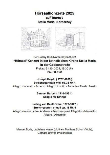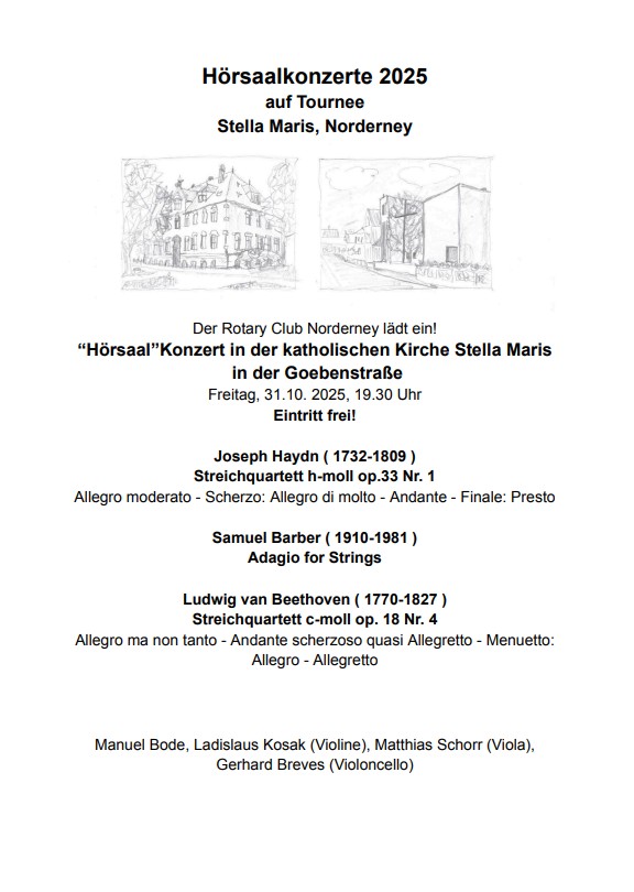 Der Rotary Club Norderney lädt herzlich zum diesjährigen Hörsaalkonzert 2025 ein. In der besonderen Atmosphäre der katholischen Kirche Stella Maris erwartet die Besucherinnen und Besucher ein hochkarätiges Kammermusikerlebnis mit Werken großer Komponisten.