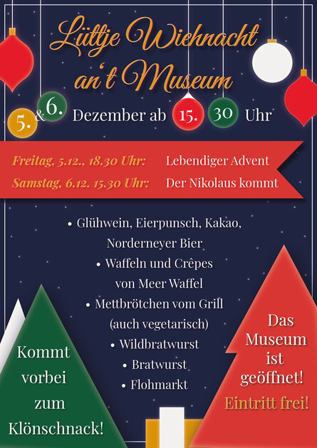 Am Freitag, 5. Dezember, und Samstag, 6. Dezember, lädt das Museum Nordseeheilbad Norderney wieder zum stimmungsvollen Weihnachtsmarkt „Lüttje Wiehnacht an’t Museum“ ein. Der kleine Weihnachtsmarkt startet jeweils um 15.30 Uhr vor dem Museum.