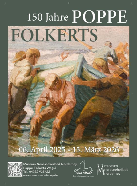 Anlässlich des 150. Geburtstages des bedeutenden See- und Landschaftsmalers von Norderney, Poppe Folkerts (1875 bis 1949), von nationalem und internationalem Rang des Deutschen Impressionismus, bezeichnet auch als der "Maler der Nordsee", zeigt das Museum Nordseeheilbad Norderney eine umfangreiche Retrospektive der Kunst von Poppe Folkerts mit rund 120 Gemälden, Zeichnungen, Radierungen und Lithografien. Die Ausstellung gewährt einen tiefen Einblick in das beeindruckende Gesamtwerk von Folkerts. So sind in seinen Bildern das Charakteristische der Landschaft, insbesondere von der friesischen Küste mit seinen Menschen, von der besonderen Faszination der Nordsee des Meeres mit seinem sich ständig ändernden Wetter, in seinen wechselnden Stimmungen, mit sonnendurchflutetem Himmel und wunderbaren Wolkengebilden in seiner einzigartigen, unverwechselbaren Intensität und Lebendigkeit verewigt. Kunst und Natur finden in den Werken von Poppe Folkerts eine unzertrennliche Einheit. Beim Betrachten der dargestellten Natur von See und Landschaft und seinen Menschen wird man so zu neuen Erfahrungshorizonten des Naturlebens geführt.