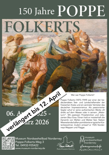 Anlässlich des 150. Geburtstages des bedeutenden See- und Landschaftsmalers von Norderney, Poppe Folkerts (1875 bis 1949), von nationalem und internationalem Rang des Deutschen Impressionismus, bezeichnet auch als der "Maler der Nordsee", zeigt das Museum Nordseeheilbad Norderney eine umfangreiche Retrospektive der Kunst von Poppe Folkerts mit rund 120 Gemälden, Zeichnungen, Radierungen und Lithografien. Die Ausstellung gewährt einen tiefen Einblick in das beeindruckende Gesamtwerk von Folkerts. So sind in seinen Bildern das Charakteristische der Landschaft, insbesondere von der friesischen Küste mit seinen Menschen, von der besonderen Faszination der Nordsee des Meeres mit seinem sich ständig ändernden Wetter, in seinen wechselnden Stimmungen, mit sonnendurchflutetem Himmel und wunderbaren Wolkengebilden in seiner einzigartigen, unverwechselbaren Intensität und Lebendigkeit verewigt. Kunst und Natur finden in den Werken von Poppe Folkerts eine unzertrennliche Einheit. Beim Betrachten der dargestellten Natur von See und Landschaft und seinen Menschen wird man so zu neuen Erfahrungshorizonten des Naturlebens geführt.