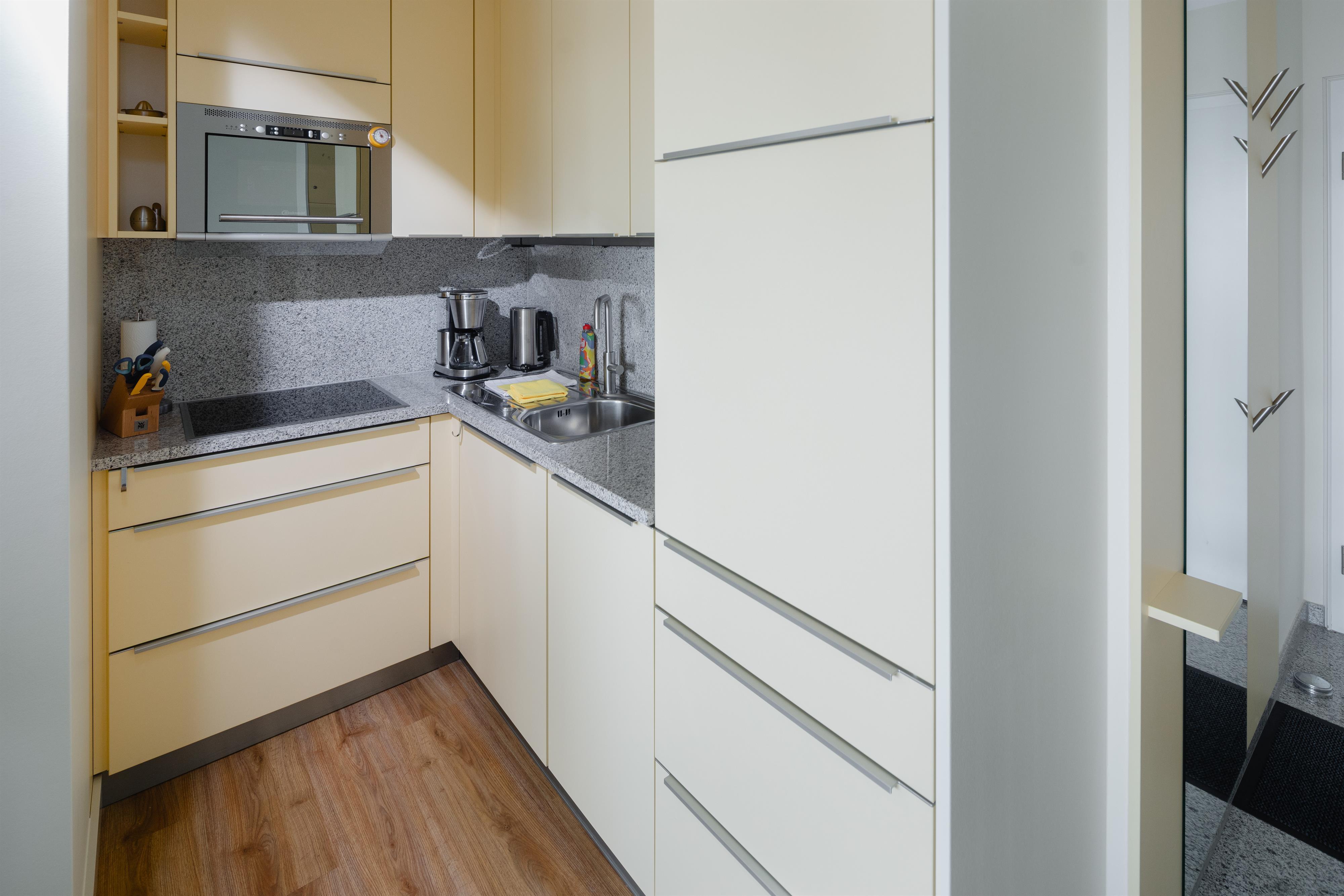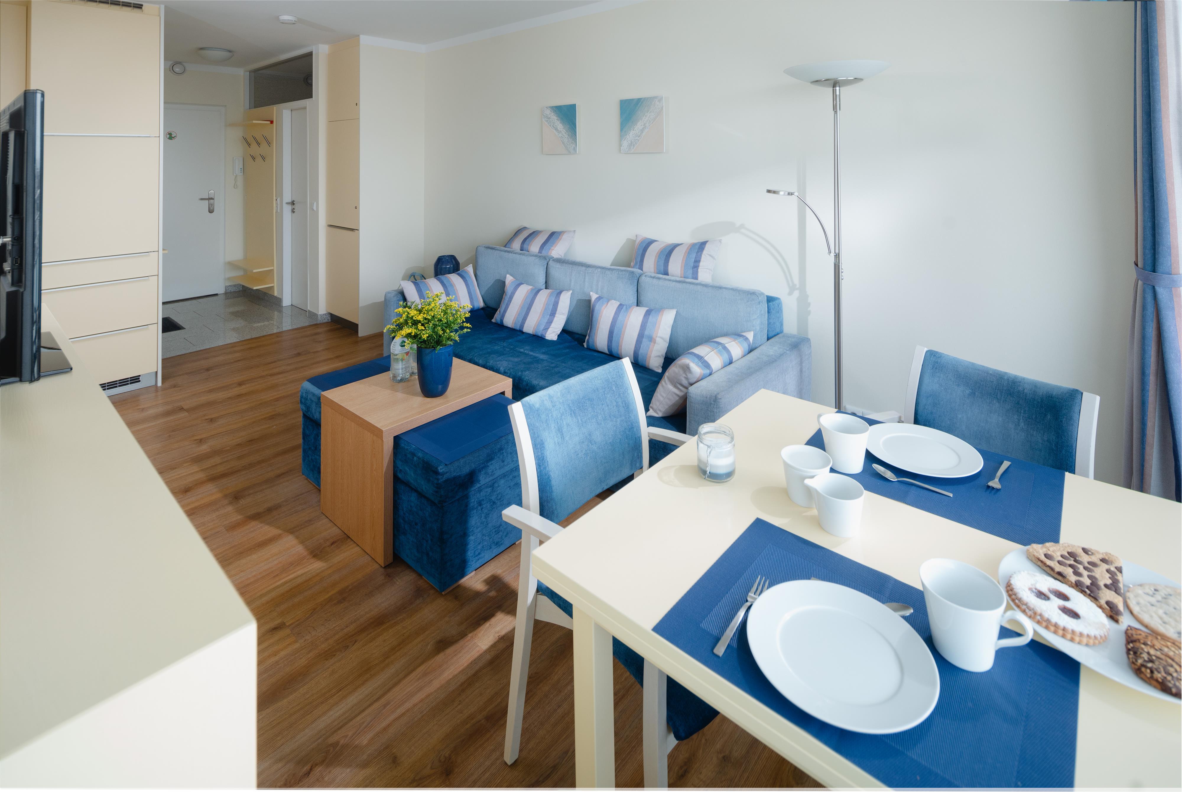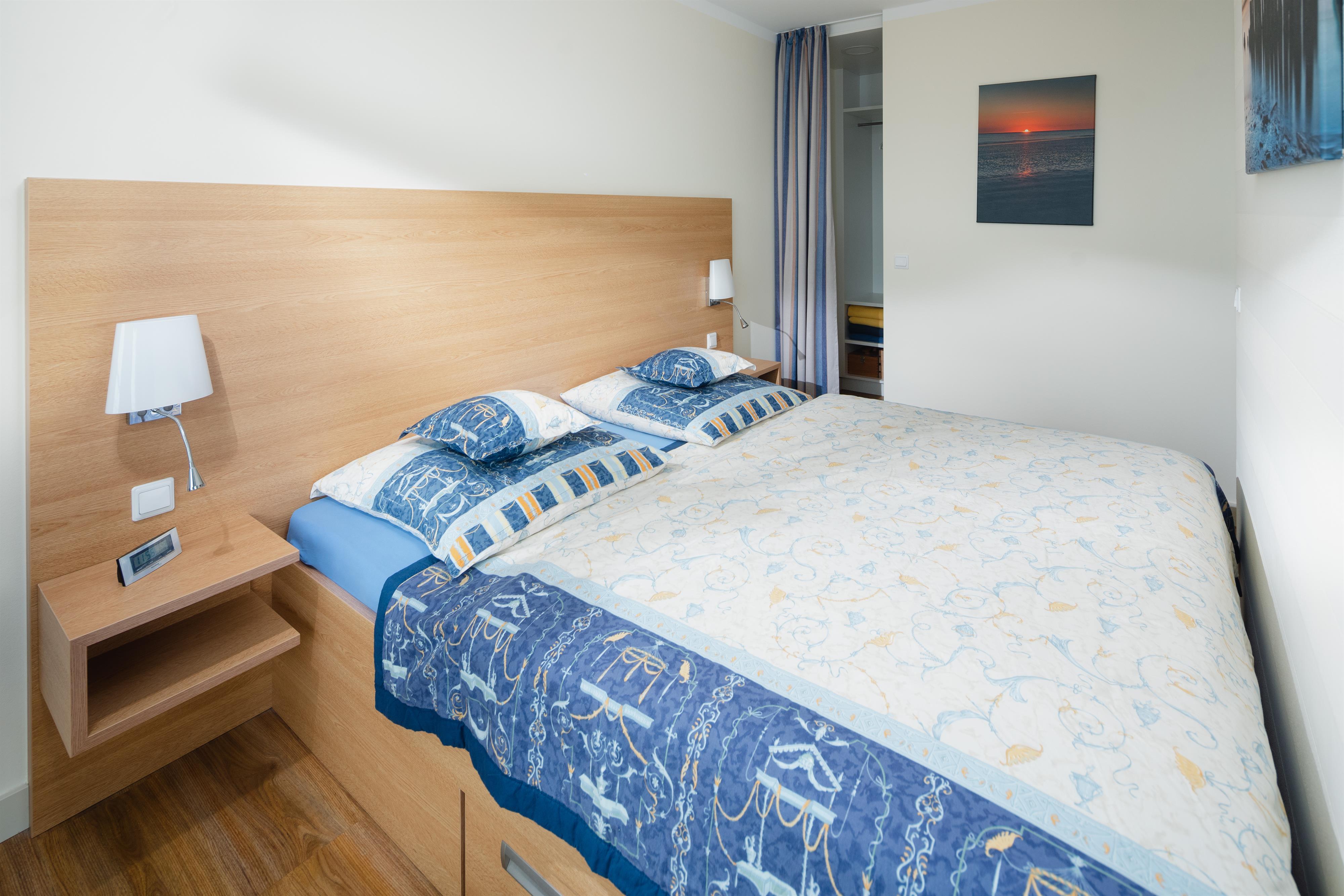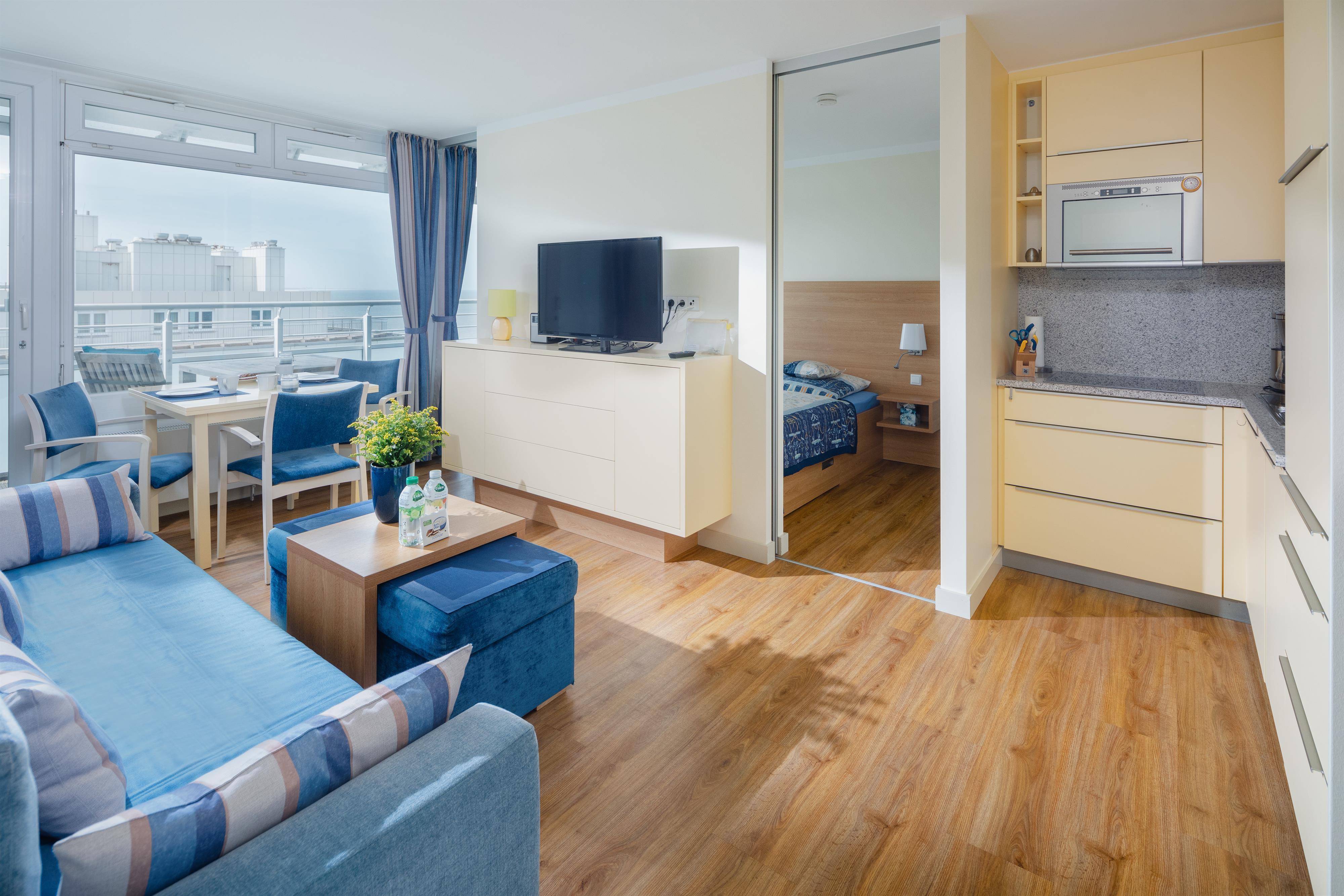 Die 2-Zimmer-Ferienwohnung bietet einen gemütlichen Wohn-Essbereich mit einem ausziehbaren Federkern Schlafsofa, einem HD-TV und einer Micro-Systemanlage mit USB-Port. Das Schlafzimmer mit Doppelbett und begehbarem Kleiderschrank ermöglicht durch die bis zum Boden reichende Fensterfront auch hier einen Blick aufs Meer. Der separate Küchenbereich ist mit Spülmaschine, Mikrowelle, Kühl-/Gefrierkombination und modernen Kleingeräten komplett ausgestattet. Im Bad aus Granit sind eine Dusche und moderne Edelstahlarmaturen verbaut.