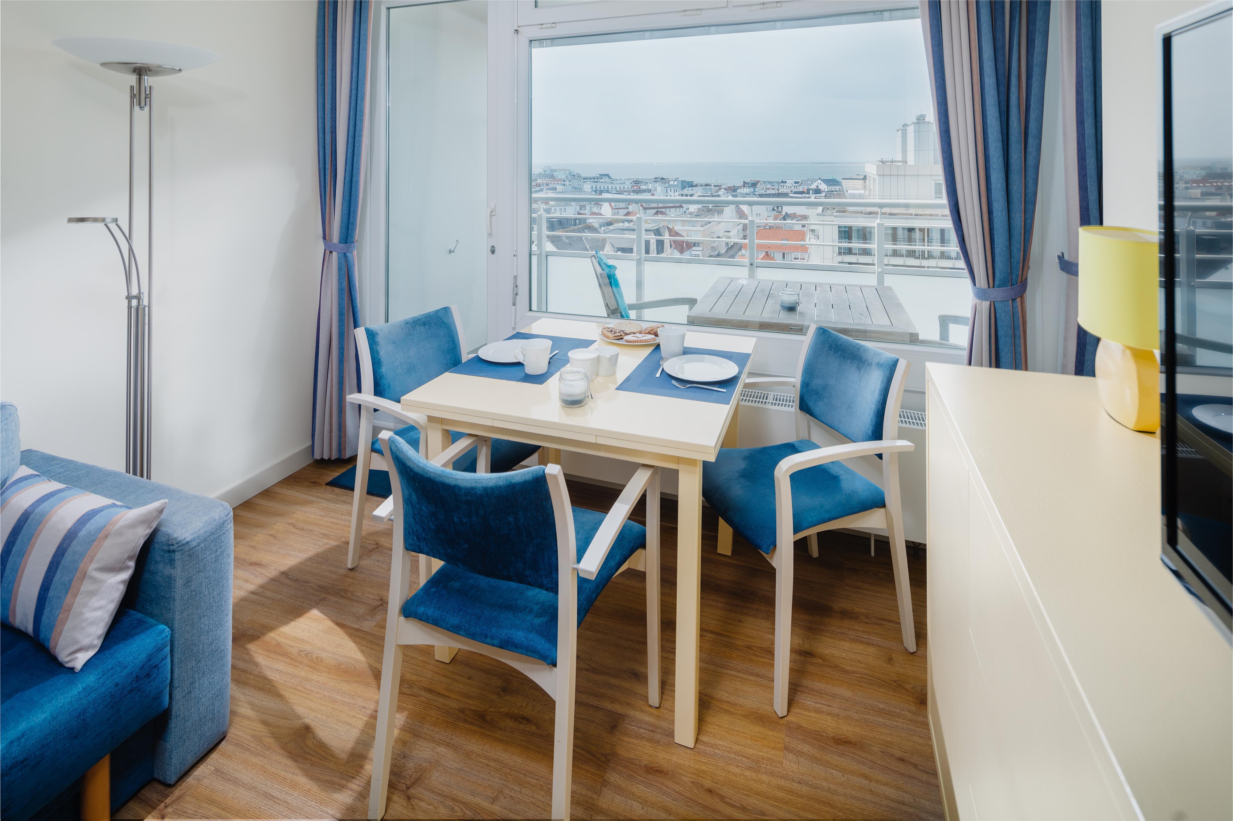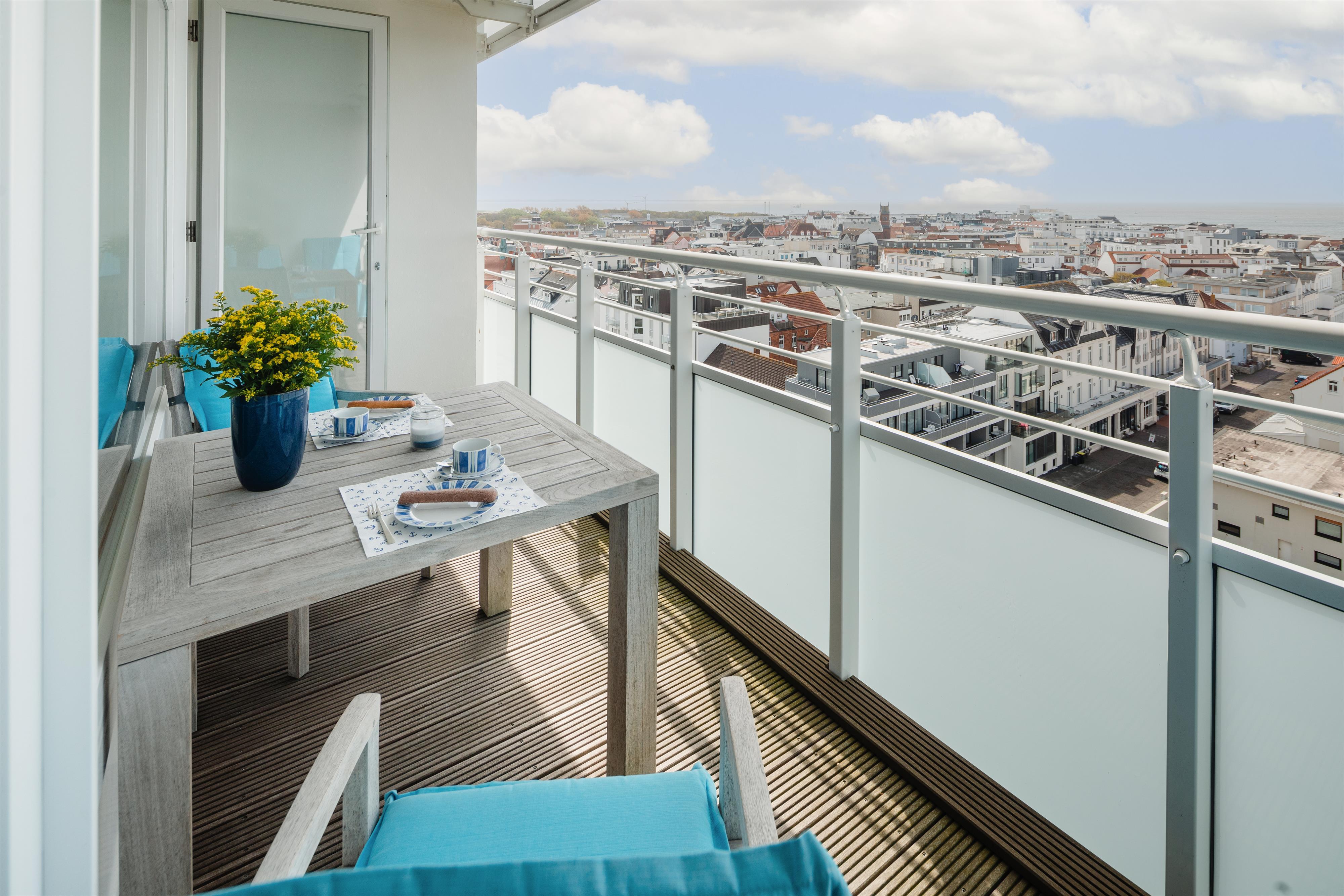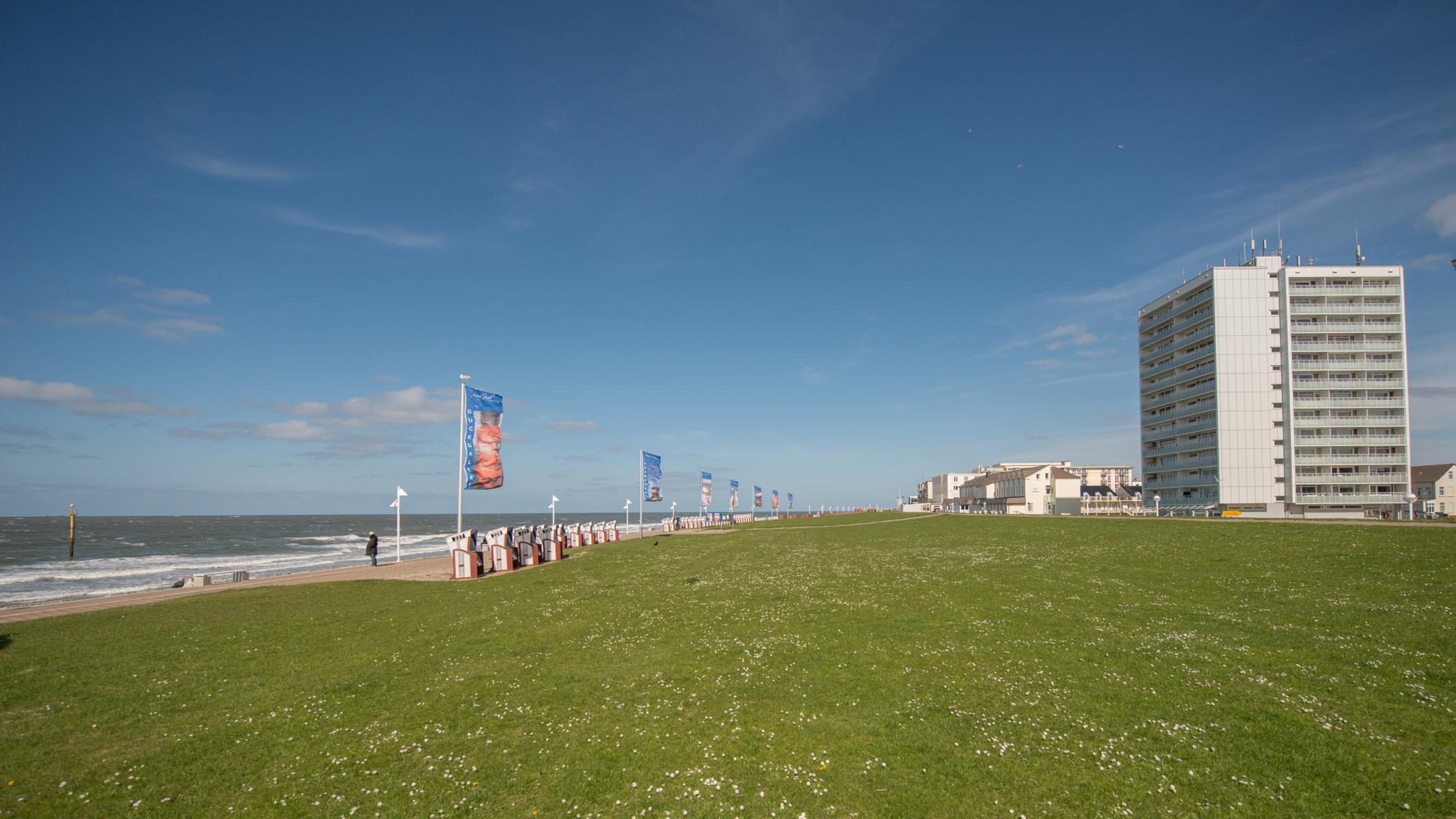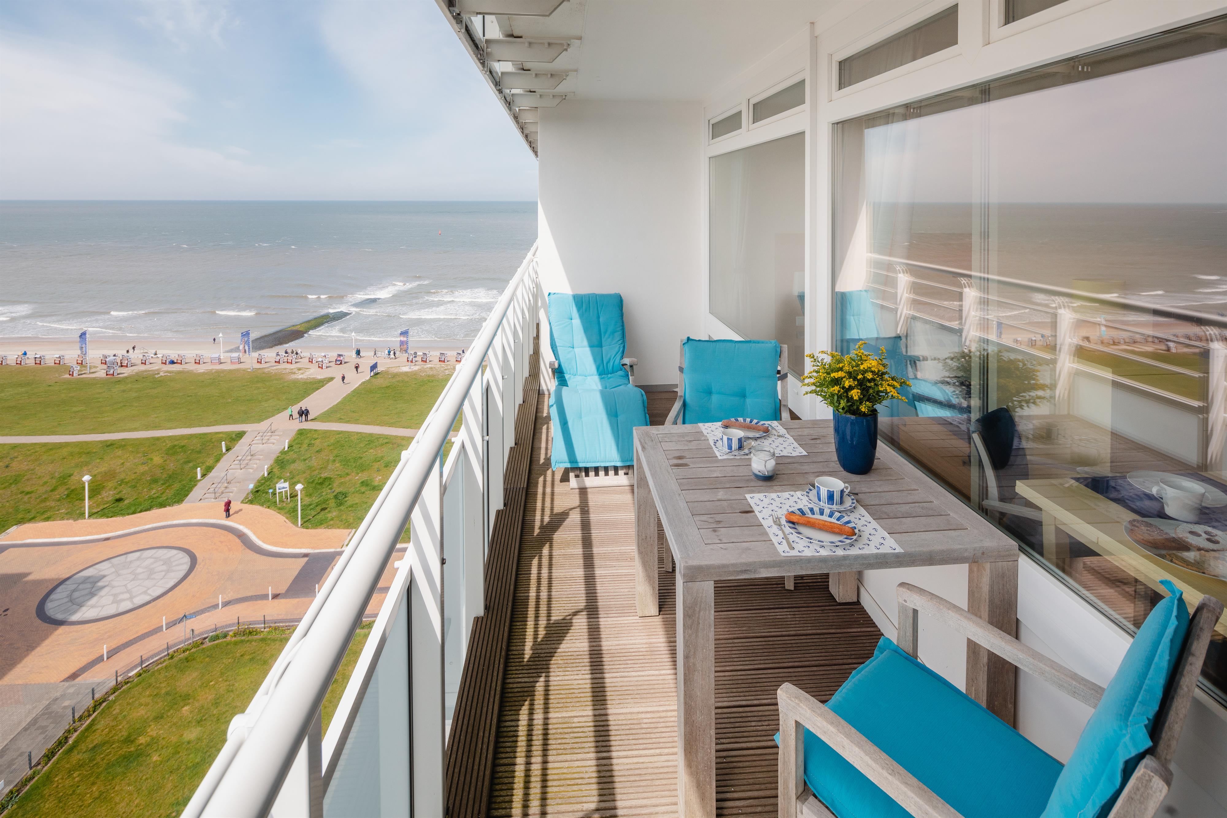 Die 2015 renovierte Nichtraucher Ferienwohnung Sonnengelb befindet sich in der 9. Etage des Hauses Nordseeblick, ausgestattet für 2 Personen. Durch die direkte Lage an der Strandpromenade und die südwestliche Ausrichtung haben Sie einen uneingeschränkten Blick auf die Nordsee und über die Insel.