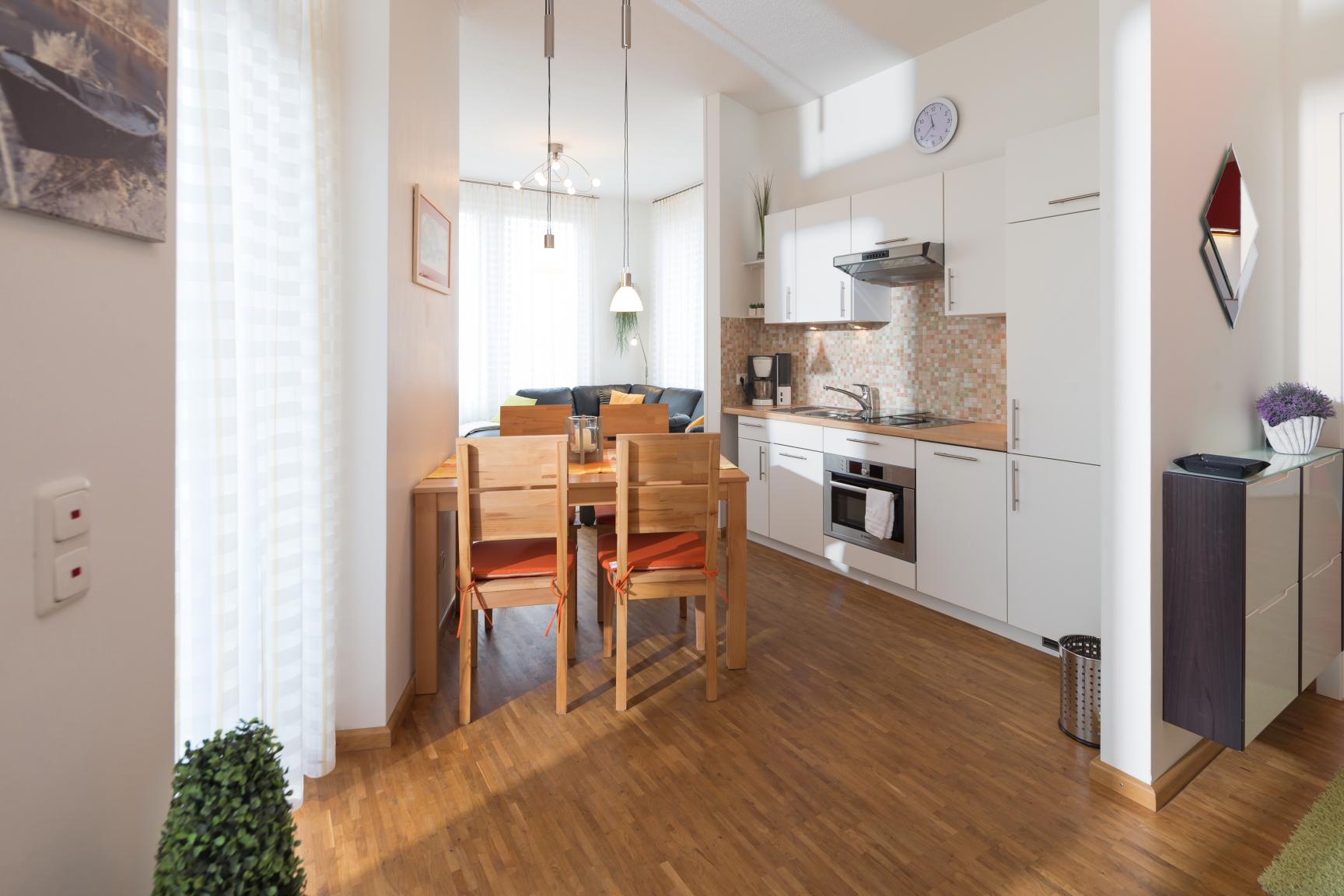Unsere schöne, lichtdurchflutete 64 m² große Wohnung im Hochparterre bietet Platz für 5 Personen. Im Jahr 2020 wurde die Wohnung erstmalig vom Deutschen Tourismusverband e. V. mit 4 Sternen ausgezeichnet.