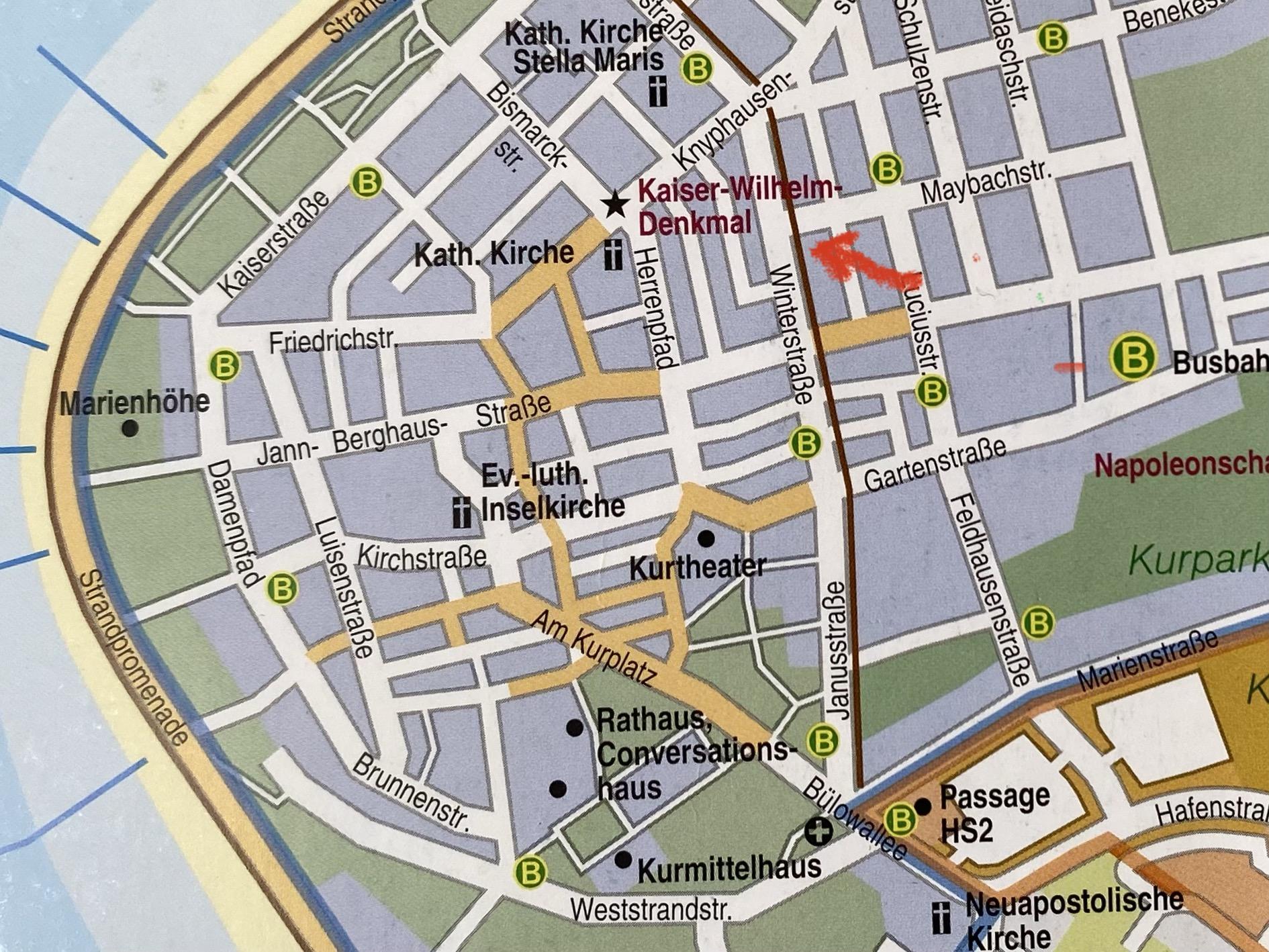 Das unmittelbar am Rand des Zentrums gelegene Haus verfügt über ein geräumiges Treppenhaus (Aufzug bis zur ersten Etage) und einen Waschraum, der jederzeit gegen Gebühr genutzt werden kann. Fahrräder können in eigener Verantwortung am Haus abgestellt werden. Die ideale Lage lässt die Besucher aber auch zu Fuß innerhalb weniger Gehminuten den Hauptstrand und alle wichtigen Erholungs- und Unterhaltungseinrichtungen (Thalassobad, Promenade, Theater, Kurplatz mit Conversationshaus,...) erreichen. Zum Be- und Entladen kann direkt vor dem Eingang geparkt werden. Die nächste Bushaltestelle befindet sich in ca. 70 m Entfernung.
