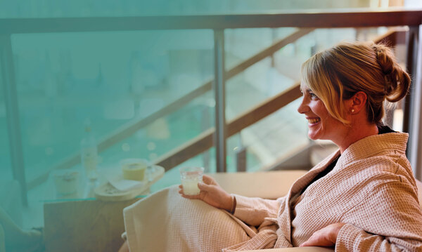 Sie genießen vier Stunden Entspannung in der Wasser- und Feuerebene des bade:haus – mit Sauna, Ruhebereichen und wohltuender Atmosphäre. - Entspannt zurück